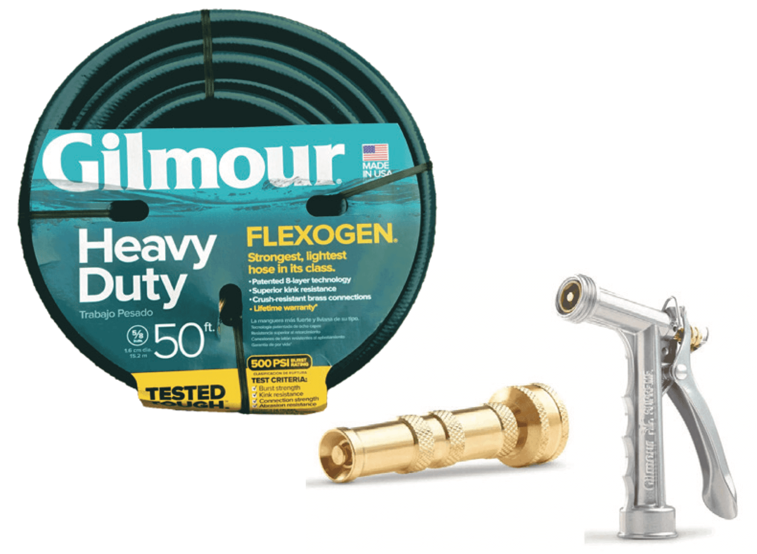 Flexogen® hose delivers superior all-around performance for your lawn, garden, deck and driveway. Count on a Flexogen® garden hose to curve without kinking, connect without leaking and hold up season upon season. Contractor Grade Pistol and 4” brass pistol watering hose nozzles combines durability and precision.